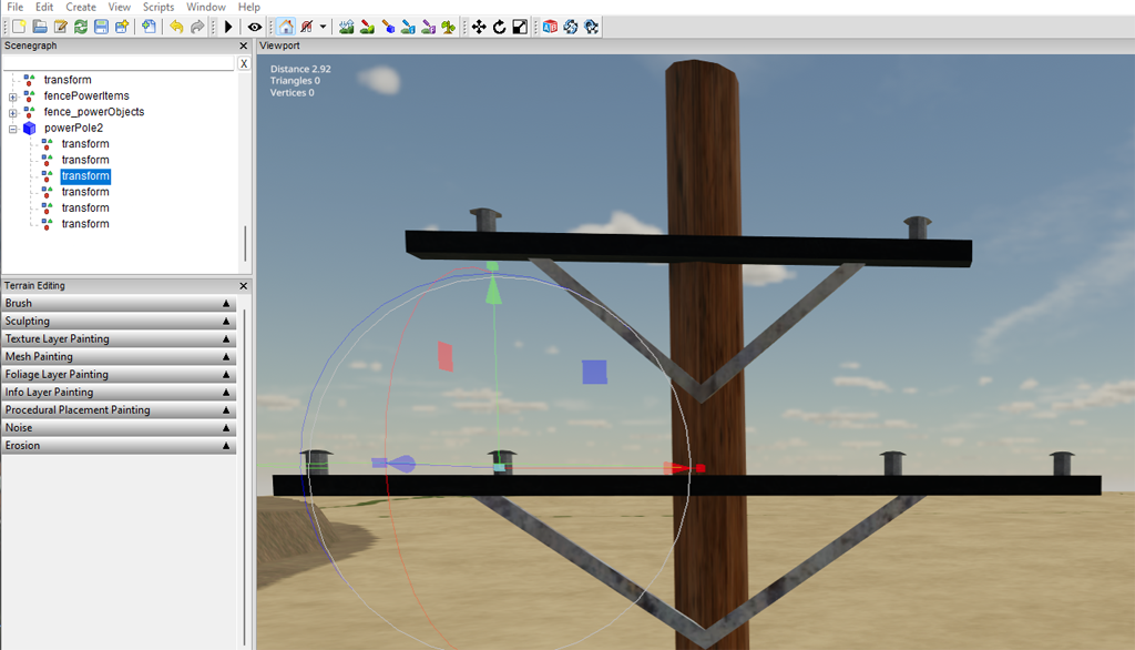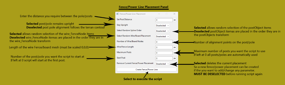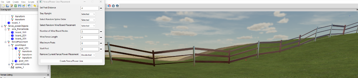 WrinkleysRule Posted September 24, 2023 Posted September 24, 2023 This script can be used to easily place fences/power lines on a map using a spline. It consists of a basic spline placement script and a modified easyFence script (by modelleicher) combined with some extra enhancements. The script works by first placing posts/poles aligned to the terrain along a spline, it then places fence boards/wires on these posts/poles scaling them to match the distance to the next post/pole. To install download the script (available at the end of this tutorial) unzip the fencePowerPlacement.zip and Copy/Paste the script into C:\Users\Your Computer Name\AppData\Local\GIANTS Editor 64bit 9.0.4\scripts. Once installed, to initiate the script select the Fence Power Placement script in the GE Scripts tab. A panel will pop up somewhere on the screen. The image below shows the Panel, together with a brief description of the Inputs/Parameters Points to Note before using this script. All posts/poles/wires/boards Must be scaled at 0,0,0 before use in the script Items to be placed Must be aligned along their ‘Z’ axis with the point of origin at one end. Number of Wire/Board alignment nodes Must be the same on all posts/poles used and in the same order top to bottom otherwise you will have crossovers between the posts. The post/pole transform group hierarchy must always start with the post mesh followed by the wire/board alignment nodes it can then be followed by any other meshes although I think best practice would be to have a single mesh for the pole/post including all the parts. The following image shows the transform group hierarchy and the telegraphPost placed using the script Above Telegraph pole taken from the FS19_telegraph pole kit by Robbie available on modhub Placing a Simple Fence Simple post, fence board creation For this example I will create a simple post/board using the Create- Primitive - Cube in GE The finished fence will consist of square posts and three fence boards If you already have a suitably aligned post and fence board then skip the next section, import post and fence wire/board into GE and go to Adding the alignment nodes to a post. section. If not continue with the following, In GE Create - Primitive - cube In the attributes panel Translate 'Y' enter 0.5 also rename this post_1 Select Edit - Freeze Transformations and select Translate - this will move the cubes point of origin to the base of the cube In the attributes panel enter the following into the Scale transforms 'X' 0.15 , ‘Y’ 1.5, 'Z' 0.15 and Freeze transformation Scale (only Scale ensure all others boxes are deselected) In the material panel in Albedo Colour enter 0.4, 0.2, 0.2 this will give a brownish colour to the post Create a second cube In the attributes panel Translate 'Z' enter 0.5 and rename this to board_1. Select Edit - Freeze Transformations and select Translate - this will move the cubes point of origin to edge of the cube In the attributes panel enter the following into the Scale transforms Scale 'X' 0.1, 'Y 0.2 'Z' 4 and Freeze Transformation Scale (only Scale ensure all others boxes are deselected) Because this second cube still uses the material name ‘Unnamed material’ it will be the same colour as the post. Create a new transform group and name this fencePowerItems Select post_1 with the middle mouse button and keeping the middle mouse button pressed move post_1 into the fencePowerItems transform group, do the same with board_1. The reason for this is to keep the transforms all set to 0,0,0, which will prevent any unseen conflicts with translation positions. With the fencePowerItems transform selected on the keyboard select Ctrl B to place it in your current view port for reference. Adding the alignment nodes to a post. Create a new transform group –Create – Transform Group Select the new transform group with the middle mouse button and keeping the middle mouse button pressed move the new transform group into the post_1 transform. If you do not have a middle mouse button then cut/paste the new transform into the post transform. Next move the new transform up to where you want the lowest board to be With the new transform selected on the keyboard select Ctrl D to duplicate then move this second transform to the centre board position, repeat this step for the third transform placing it where the top board will be. Your post_1 alignment transforms should look like the post in the alignment image above. Your post transform should look like the following image Open your map in GE Create a spline – Create- Spline rename to spline_1 and align it along the route you want to place your fence. Select Scripts – Fence Power placement to initiate the script. In the Scenegraph a new transform group ‘fence_powerObjects’ will have been created consisting of three transform groups wire_fenceNode – place the fence board(s), wire(s) in this transform group fencePlacement Transform Group postObject – place your post(s)/ pole(s) in this group placedObjects – your complete fence/power line will be placed in this group when the script has been executed (select Create Fence/Power Line) The spline has to be placed in the fencePlacement Transform Group For those familiar with the original Spline Placement script this fencePlacement Transform Group works in the same way as the Spline Placement script. I have renamed the post_1 and board_1 meshes to post1S1,board_1S1 (S1 being spline_1) respectively. Unfortunately GE will scale all objects of the same name throughout the map so I have done this so that I can easily freeze the scale transformations on the completed fence/power line without affecting any other mesh in the map. Copy/Paste board_1 into the wire_fenceNode transform (rename if you want to). Copy/Paste post_1 into the postObject transform. (rename if you want to). Cut/Paste the spline into the fencePlacement transform Set Post Distance – 4 – posts will be set 4m apart Stay Upright – Selec