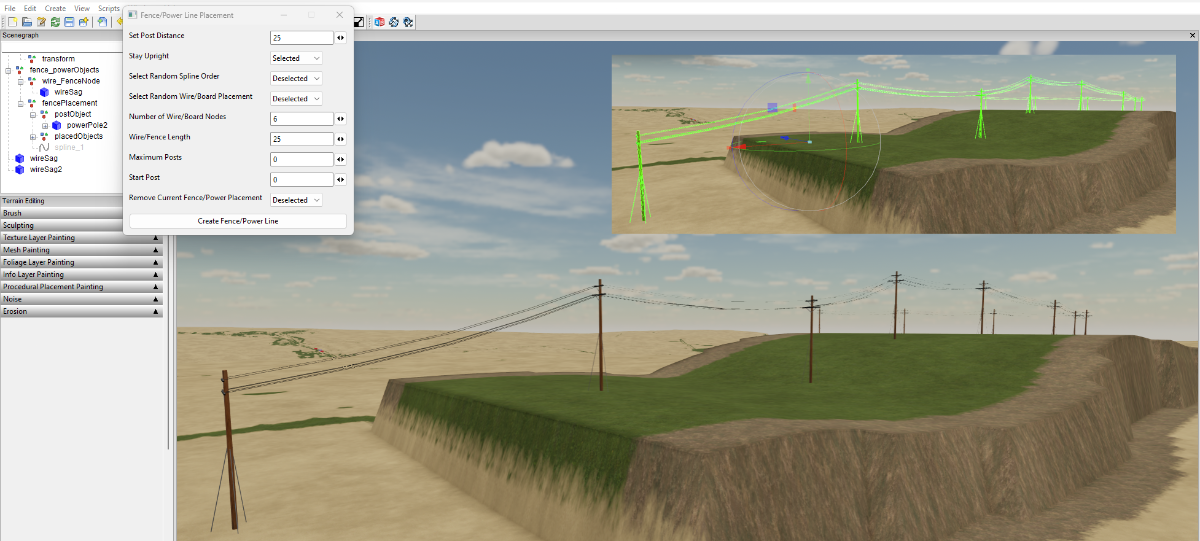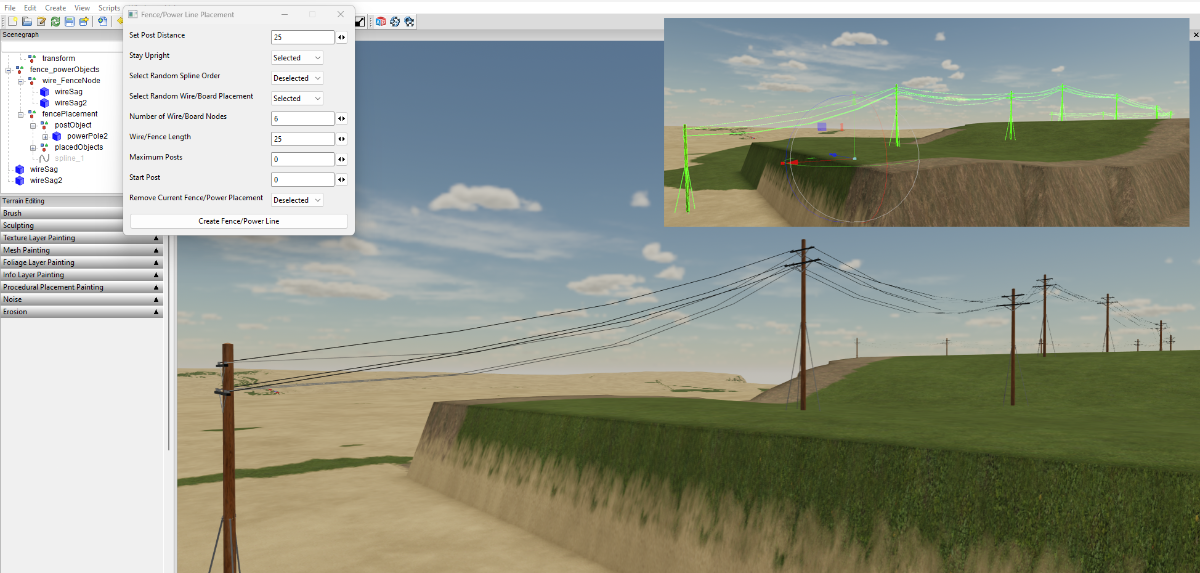 WrinkleysRule Posted September 29, 2023 Author Posted September 29, 2023 (edited) Heres a little extra when placing power lines, after placing select the Spline Paint Panel script and in the settings, Set Centre Width -- 2 Set Edge Width -- 0.5 Set Edge Texture Left -- Select --Rough Grass Set Centre Texture -- Select -- Gravel Set Edge Texture Right -- Select --Rough Grass Set Texture Distance -- to the distance between your post Select Paint button Grass gravel will be placed at the base of each of your poles, due to the way the terrain segments are painted in GE some may be placed slightly to one side of the pole Note: If the distance between your poles is more than 50m then you will need to adjusy the texsDistance value at line 127 in the script from 50 to a suitable larger setting eg 150 (150m) Spline Paint Panel script available at the end of this tutorial https://farmerboysmodding.com/index.php?/topic/2439-new-spline-paint-height-csv-field-creationdimension-panel-scripts You can also use the Paint Foliage by spline script in the same way The Fence_Power_Placement script has also been updated (08/10/2023) Edited October 8, 2023 by WrinkleysRule Script Update